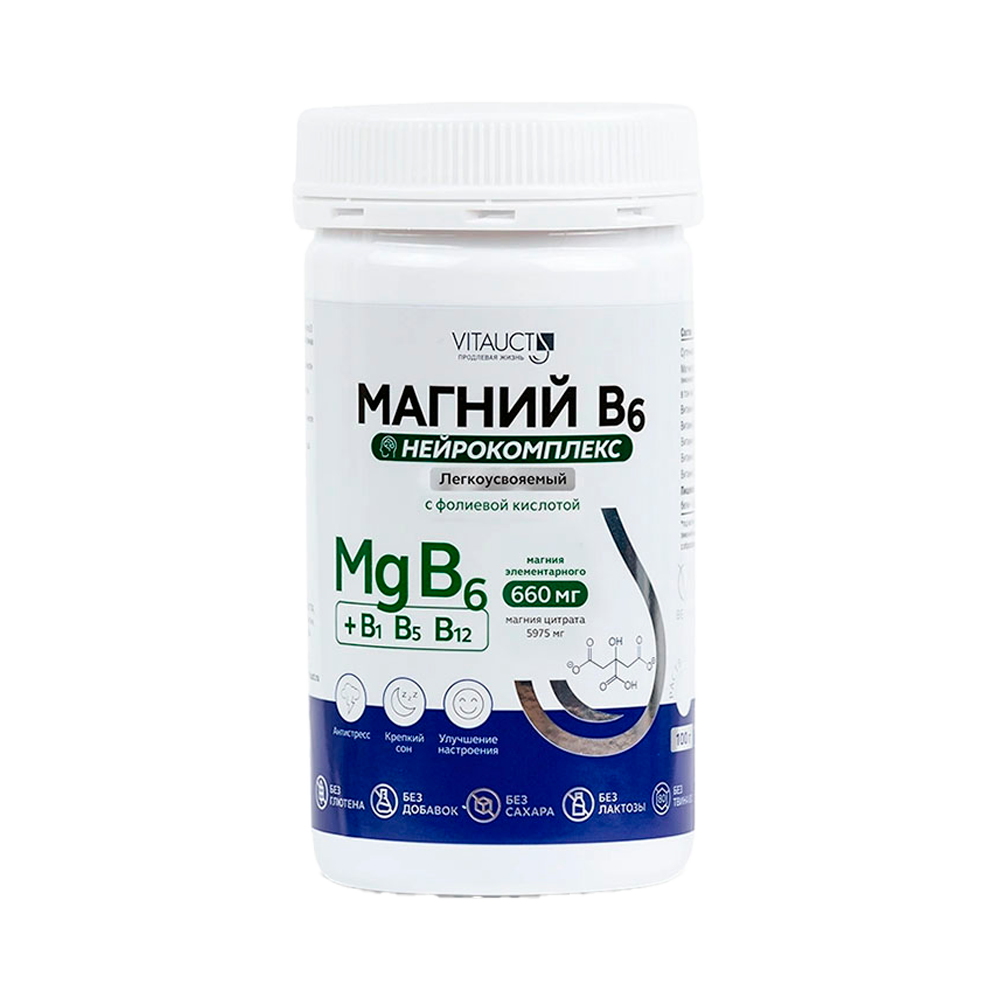 Легкоусвояемая цитратная форма магния с витаминами группы В. Mg + B6 (пиридоксин) +B1 (тиамин) + B5 (пантотеновая кислота) + В9 (фолиевая кислота) + B12 (цианокобаламин) нормализуют состояние нервной системы при эмоциональном напряжении, депрессии, неврозе, снижают возбудимость нервной ткани и, как следствие, уменьшают тревогу.