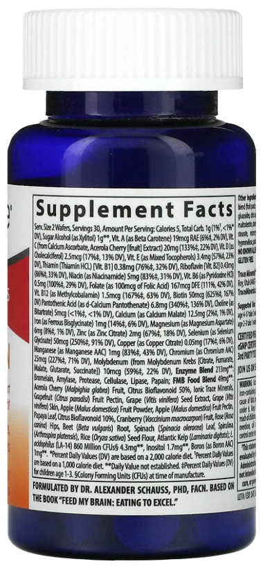 | плод мальпигии гранатолистной (Malpighia glabra), цитрусовый биофлавоноид 50%, микроэлементы иона, грейпфрутовый пектин (Citrus paradisi), экстракт виноградных косточек (Vitis vinifera), виноградная кожура (Vitis vinifera), яблочный порошок (Malus domestica), яблочный пектин (Malus domestica), листья папайи, цитрусовый биофлавоноид 10%, клюква (Vaccinium macrocarpon), экстракт баланитеса (Balanites aegyptiaca), шиповник (Rosa canina), корнеплод свеклы (Beta vulgaris), листья шпината (Spinacia oleracea), спирулина (Arthrospira platensis), рисовая мука (Oryza sativa), атлантическая листовая капуста (Laminaria digitata); L acidophilus (LA-14) 860 млн КОЕ§ 4,3 мг**, инозитол 1,7 мг**, бор (в виде бора AAC) 1 мг**. |